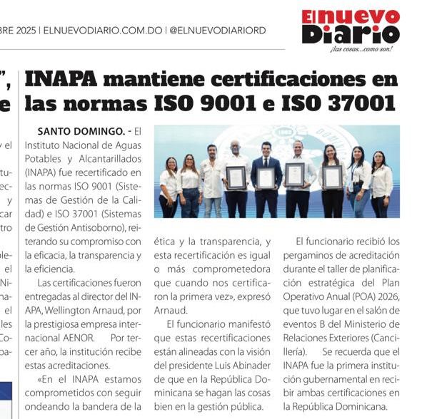 Santo Domingo, República Dominicana. – El Instituto Nacional de Aguas Potables y Alcantarillados (INAPA) fue recertificado en las prestigiosas normas internacionales ISO 9001 (Sistemas de Gestión de la Calidad) e ISO 37001 (Sistemas de Gestión Antisoborno), reafirmando una vez más su compromiso con la eficiencia, la transparencia y la integridad en todos los procesos institucionales.